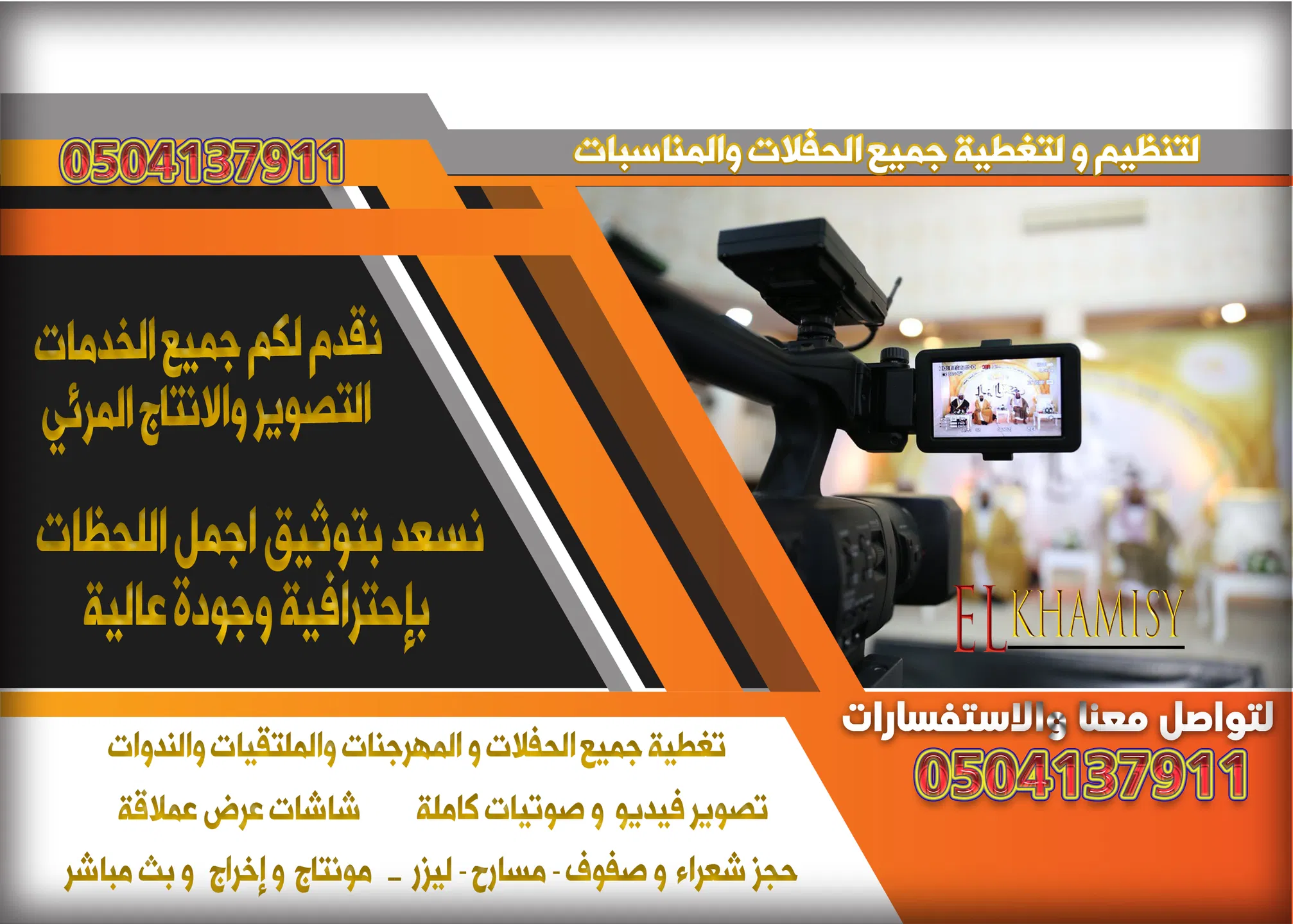 فريق متخصص في تصوير الحفلات والزواجات لنبقيها لكم ذكرى جميلة لا تنسى ،0504137911 نتميز بأننا نقدم افضل جودة في التصوير وبأسعار منافسة جداً. نقدم جميع خدمات التصوير والإنتاج تحت إدارة وإشراف طاقم ذو خبرة عالية. خدماتنا: - تصوير فوتوغرافي - تصوير فيديو - جلسات تصوير خاصة - بث مباشر (يوتيوب/شاشات) - تصوير تجهيزات العريس - تصوير الموكب - أنظمة صوتيات متكاملة (سماعات/مايكات) والعديد من الخدمات الأخرى. يمكنك التواصل معنا على الواتساب لمشاهدة أعمالنا كاملة، متواجدون لخدمتكم على مدار اليوم بالكامل. للتواصل والأستفسارات:0504137911